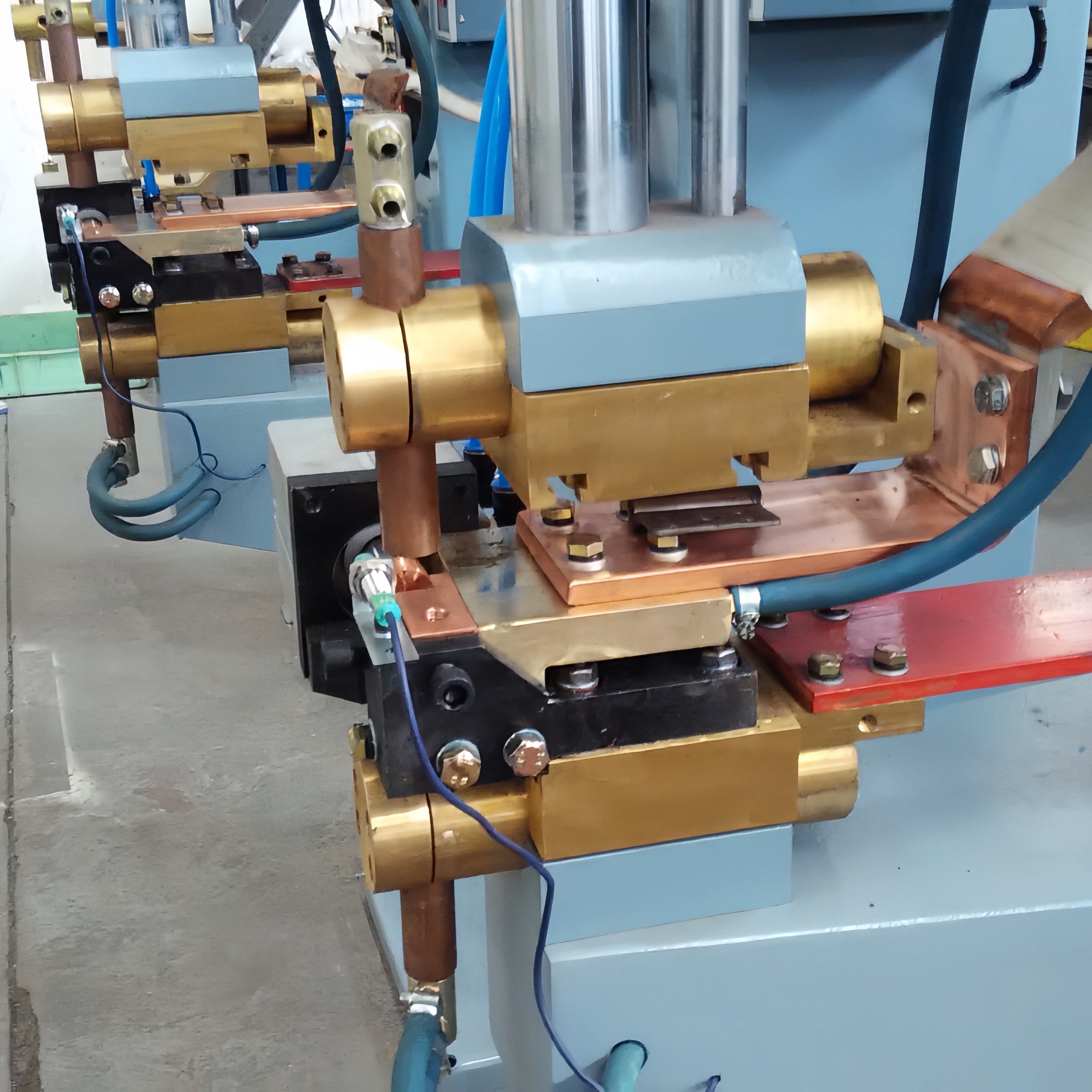 The DN Series Automatic Door Hinge Welding System is a turnkey production cell built upon the proven reliability of the DN Series resistance welding platform, enhanced with custom automation for hinge manufacturing. The system automates the complete welding sequence: precise loading of hinge components into custom fixtures, accurate positioning under the welding electrodes, execution of programmed spot welds, and controlled discharge of finished assemblies. Utilizing precision actuators or optional robotic positioning, the system guarantees each weld is placed accurately according to hinge design specifications. Governed by the SUN18B Intelligent Microprocessor Controller, the entire process—from motion coordination to weld parameter execution—is seamlessly integrated to produce flawless, consistent hinge assemblies.